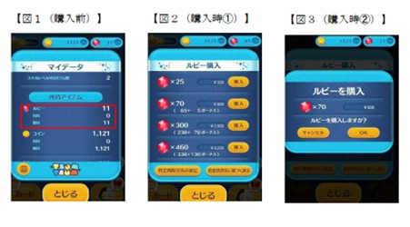 次に掲げる各図でいえば、ルビーを70個購入した場合、購入ルビー(有料ルビー)が65個、購入ルビー(無料ルビー)が5個付与される(図2の「ボーナス」が購入ルビー(無料ルビー)をいう。)。